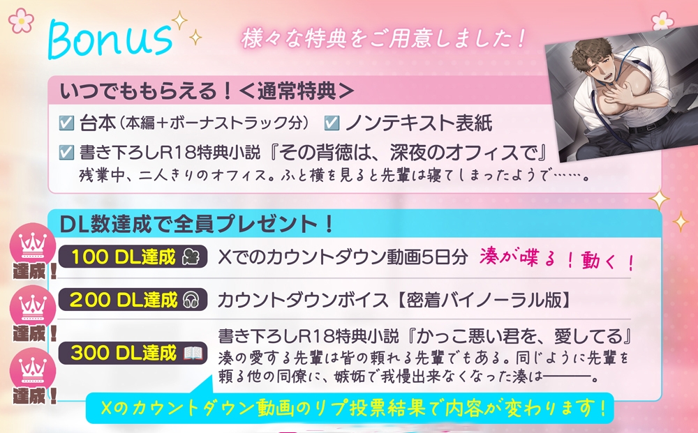 | ジャンル | バイノーラル/ダミヘ 雄っぱい オフィス/職場 女性優位 体格差 オホ声 男性受け 乳首責め |